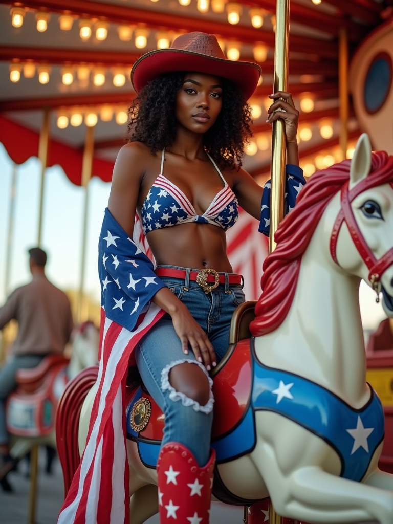 model confidently posed on top of a vibrant carnival carousel horse painted in stars and stripes, the scene bursting with red, white, and blue colors. she is dressed in classic american western clothes, adorned with a stars and stripes bikini, denim hot pants with flag patches , accentuating her red, white and blue cowboy boots. the ensemble is completed with a stars and stripes cowboy hat, American flag draped over her shoulders. the carnival atmosphere is enhanced by patriotic bunting and twinkling red, white, and blue lights.