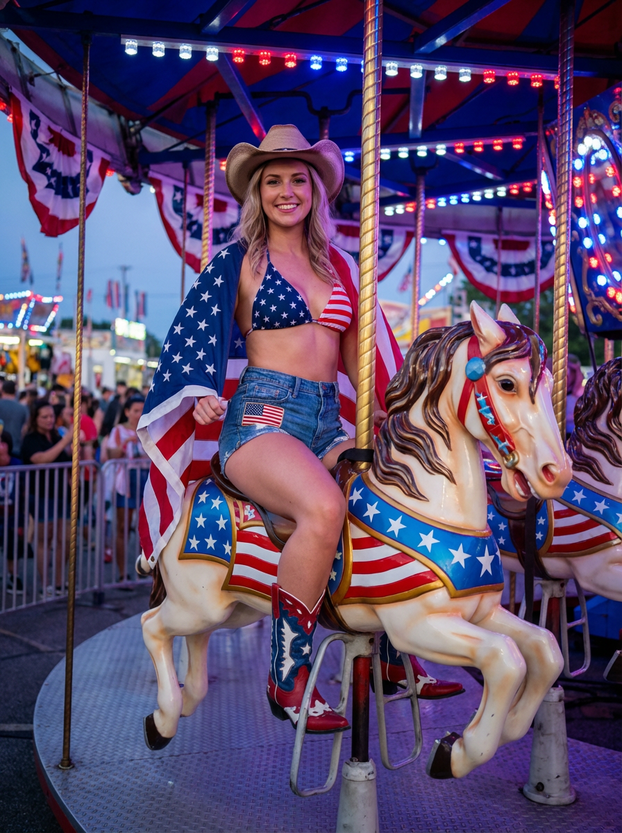 model confidently posed on top of a vibrant carnival carousel horse painted in stars and stripes, the scene bursting with red, white, and blue colors. she is dressed in a stars and stripes bikini, denim hot pants with flag patches , accentuating her red, white and blue cowboy boots. the ensemble is completed with a stars and stripes cowboy hat, American flag draped over her shoulders. the carnival atmosphere is enhanced by patriotic bunting and twinkling red, white, and blue lights.