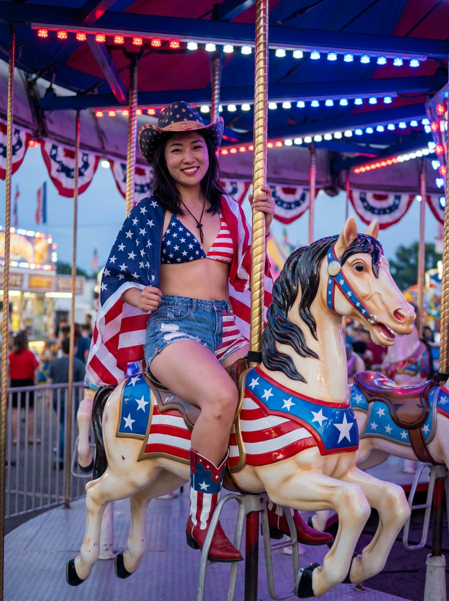 model confidently posed on top of a vibrant carnival carousel horse painted in stars and stripes, the scene bursting with red, white, and blue colors. she is dressed in a stars and stripes bikini, denim hot pants with flag patches , accentuating her red, white and blue cowboy boots. the ensemble is completed with a stars and stripes cowboy hat, American flag draped over her shoulders. the carnival atmosphere is enhanced by patriotic bunting and twinkling red, white, and blue lights.