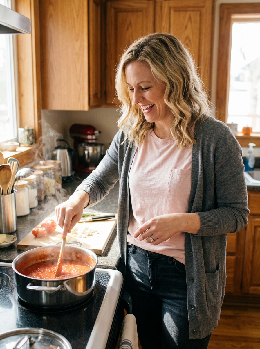 model cooking in kitchen, domestic happy moment, casual home clothes, warm inviting scene