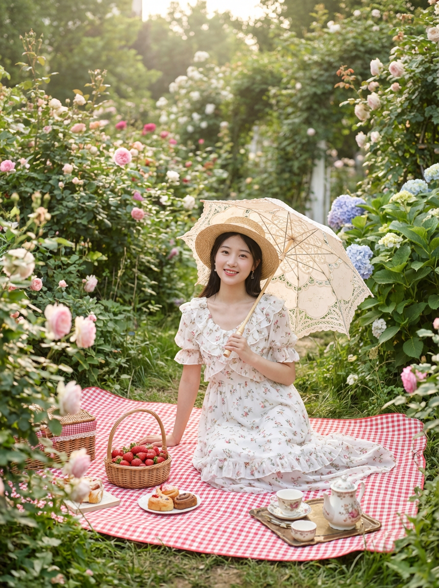 model coquette picnic aesthetic, gingham blanket, strawberries, lace parasol, romantic garden setting
