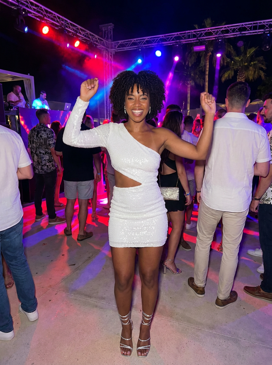 model dancing at an open-air club, wearing a white sequined dress with strappy heels , DJ lights and vibrant atmosphere
