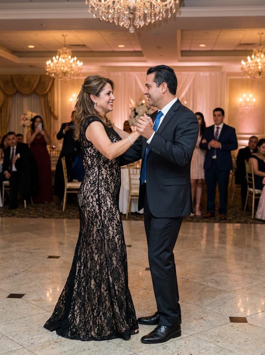 model dancing waltz at quinceanera, with chambelan partner, elegant ballroom, romantic first dance