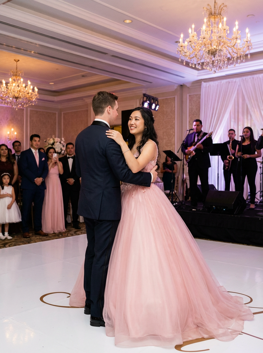 model dancing waltz at quinceanera, with chambelan partner, elegant ballroom, romantic first dance