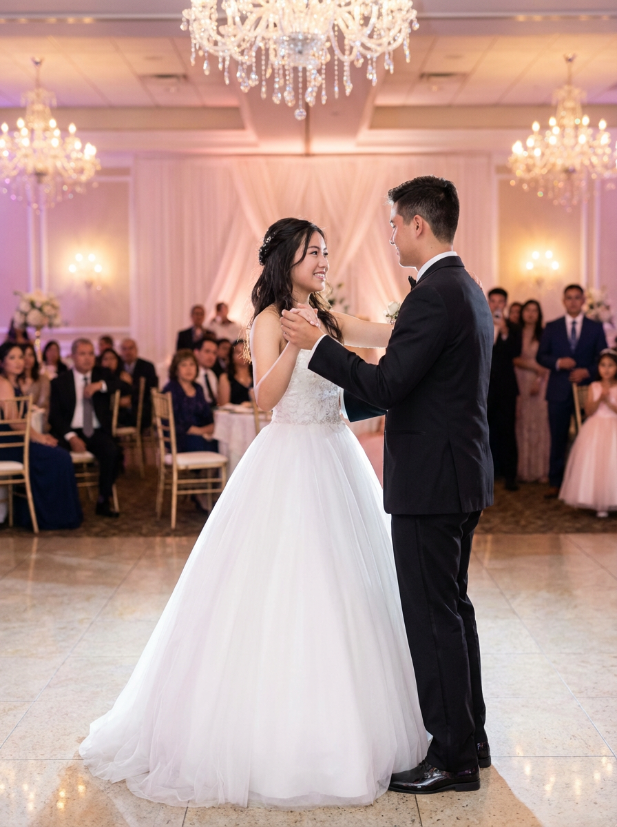 model dancing waltz at quinceanera, with chambelan partner, elegant ballroom, romantic first dance