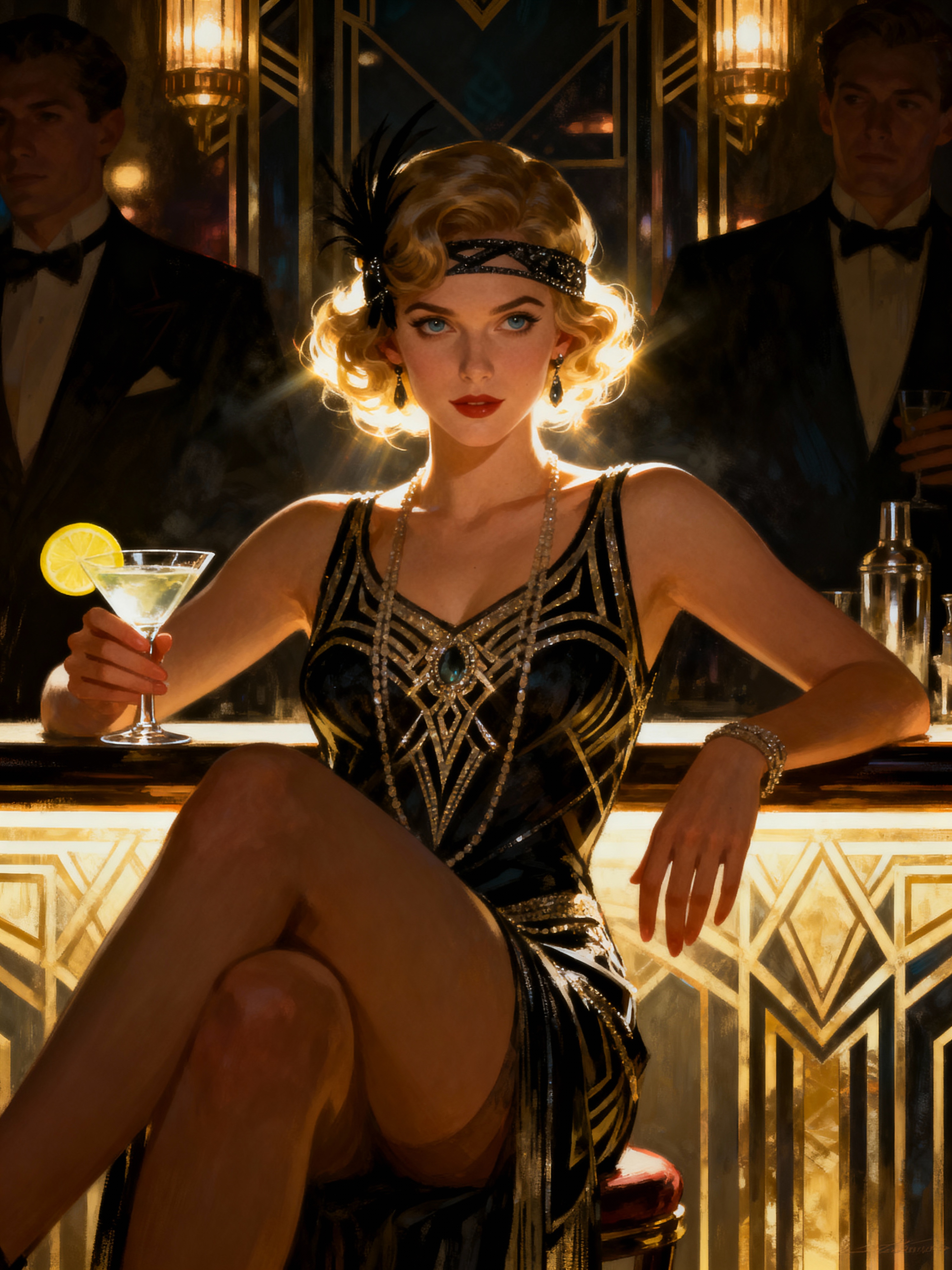 model, dimly lit upscale 1920s speakeasy, relaxed pose, fantasy, art deco, detailed painterly digital art style by coles phillips and alfred charles parker, πΈπ