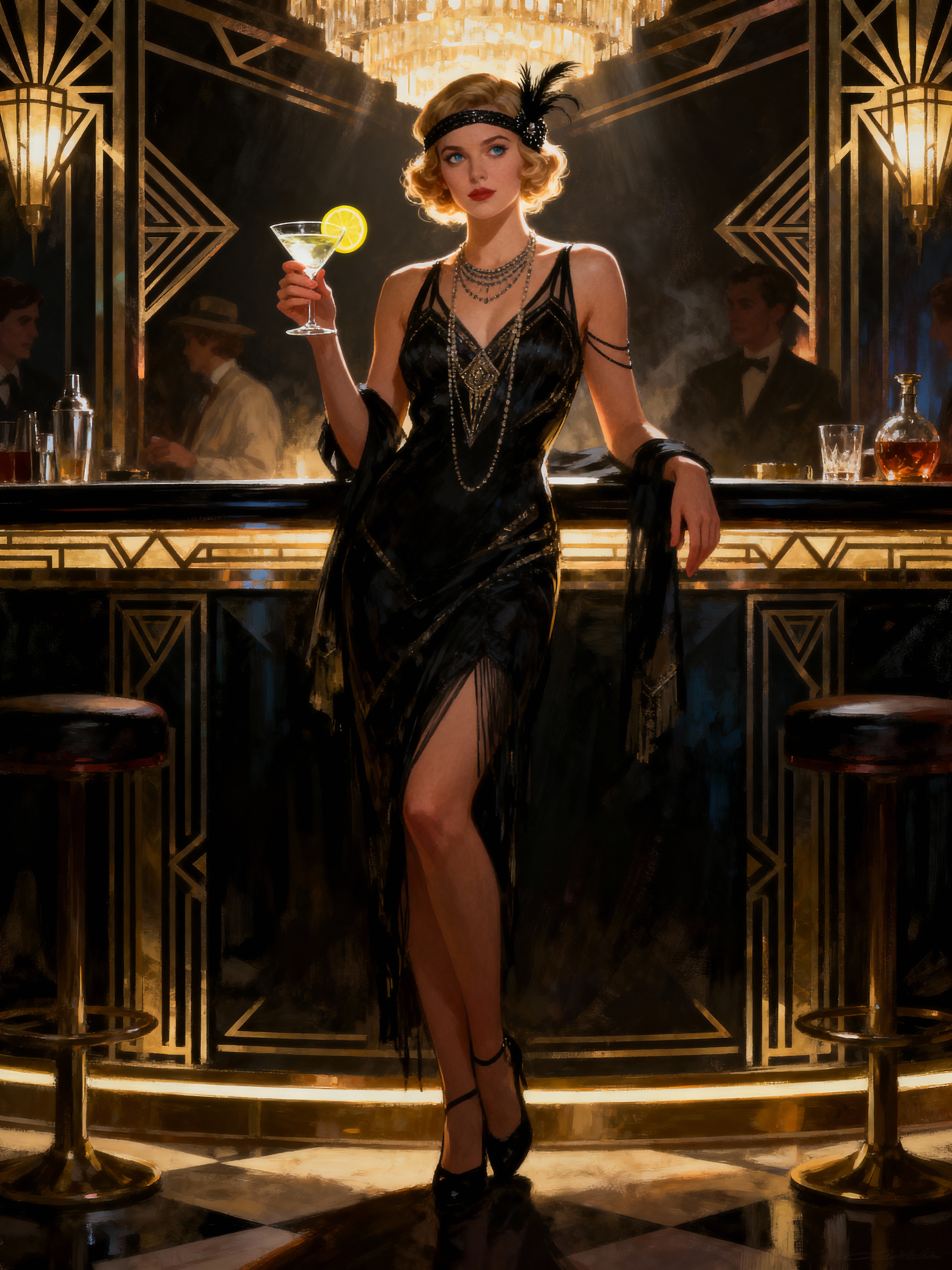 model, dimly lit upscale 1920s speakeasy, relaxed pose, fantasy, art deco, detailed painterly digital art style by coles phillips and alfred charles parker, πΈπ