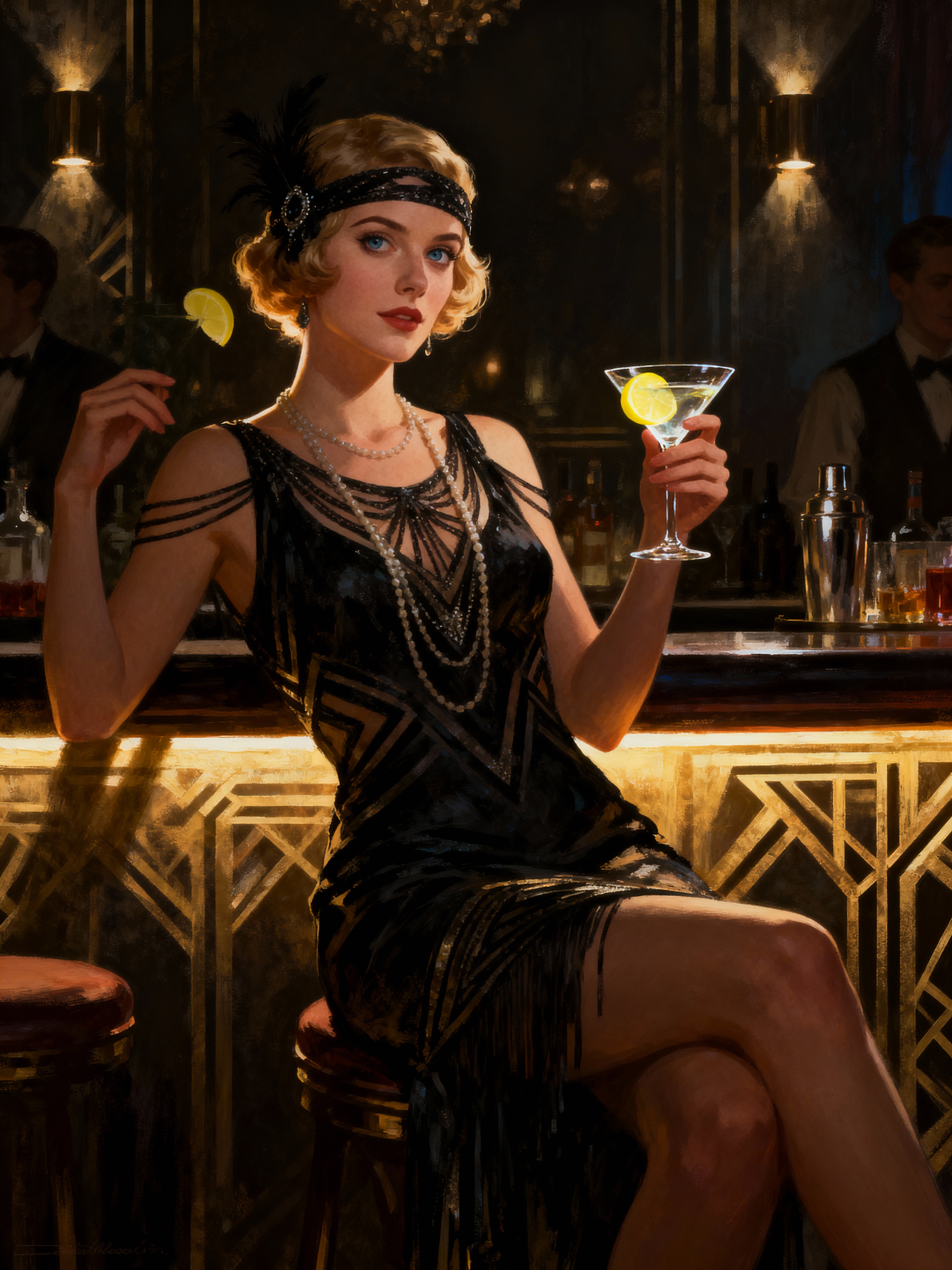model, dimly lit upscale 1920s speakeasy, relaxed pose, fantasy, art deco, detailed painterly digital art style by coles phillips and alfred charles parker, πΈπ