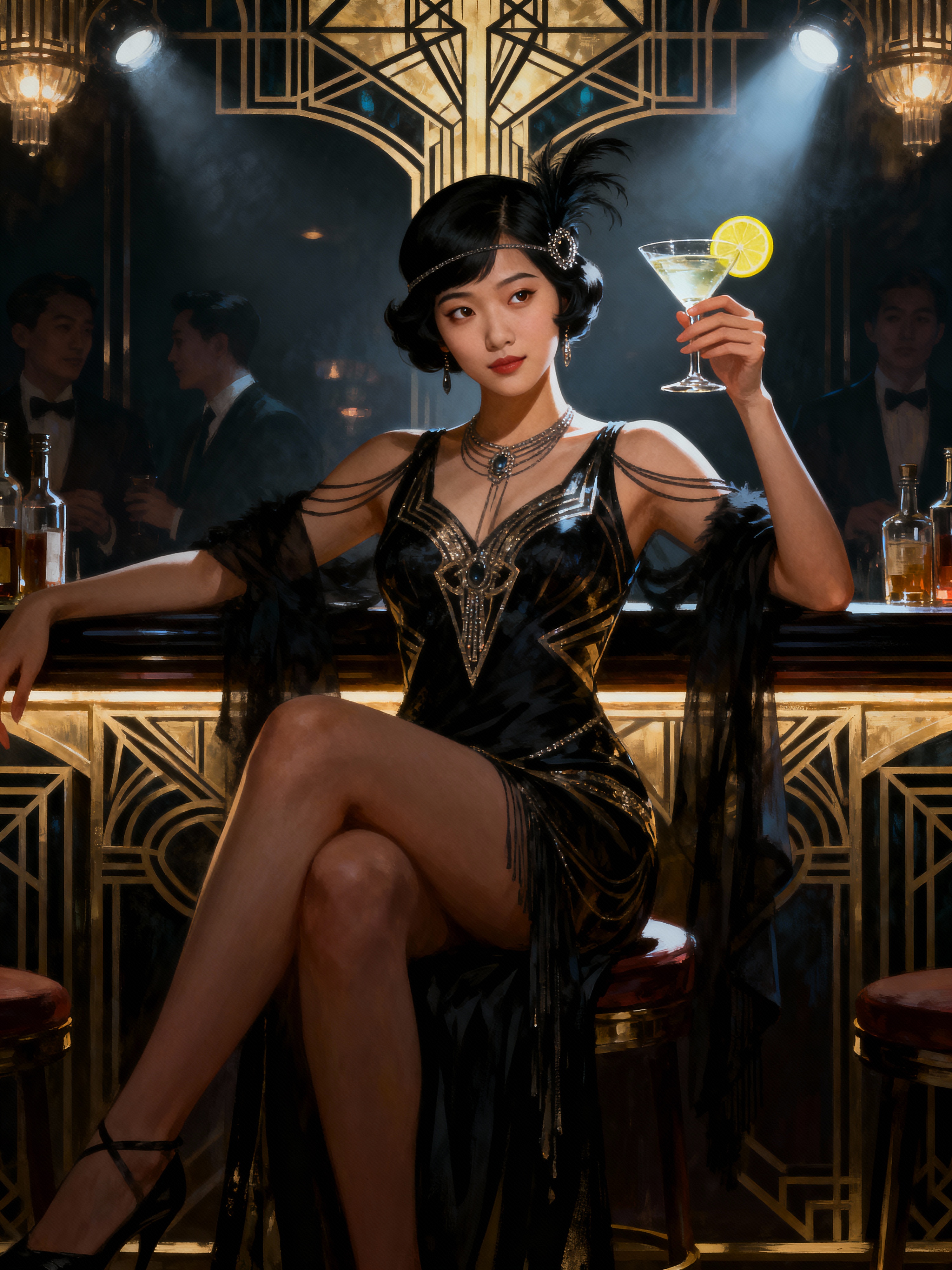 model, dimly lit upscale 1920s speakeasy, relaxed pose, fantasy, art deco, detailed painterly digital art style by coles phillips and alfred charles parker, πΈπ