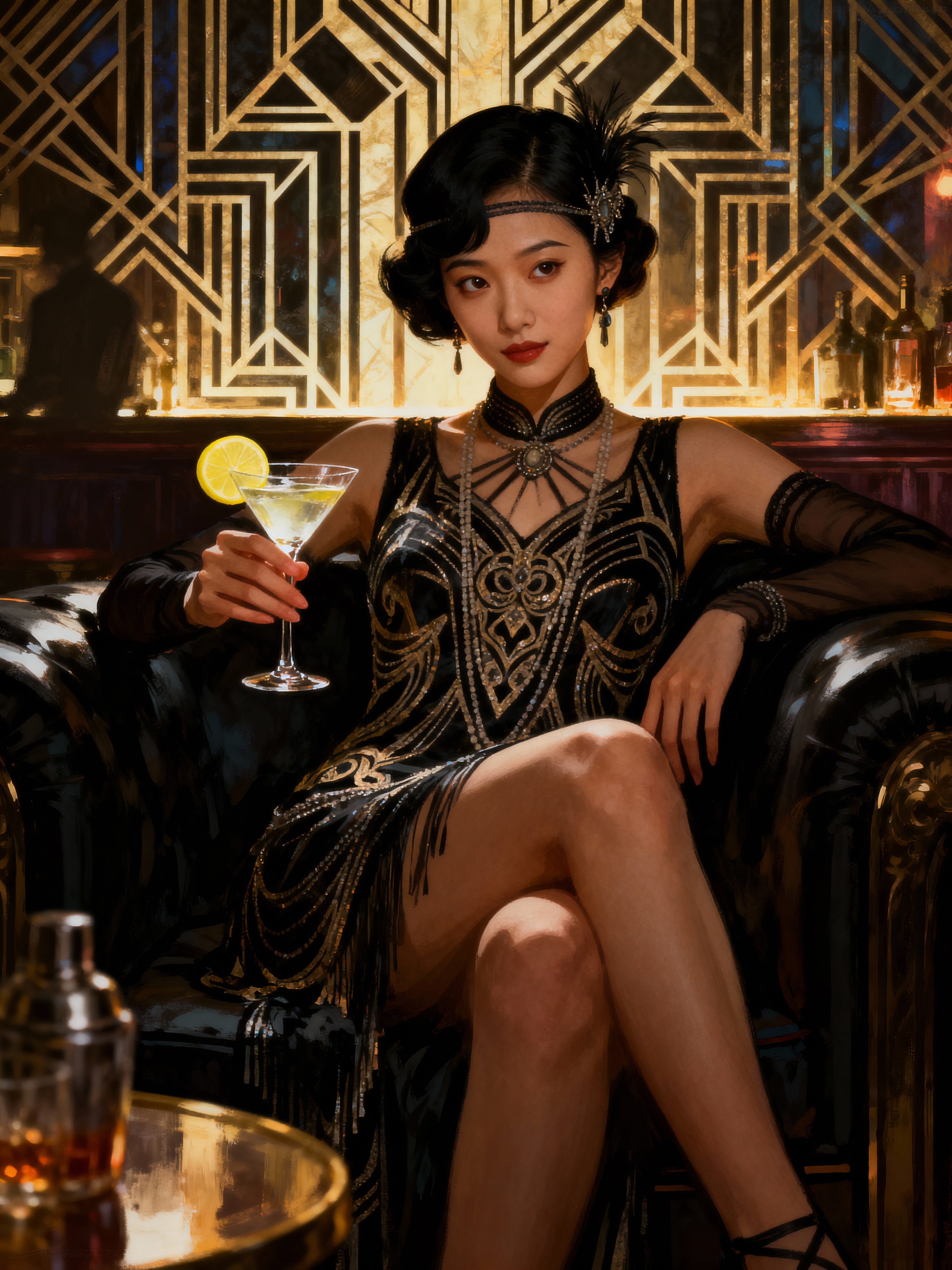 model, dimly lit upscale 1920s speakeasy, relaxed pose, fantasy, art deco, detailed painterly digital art style by coles phillips and alfred charles parker, πΈπ