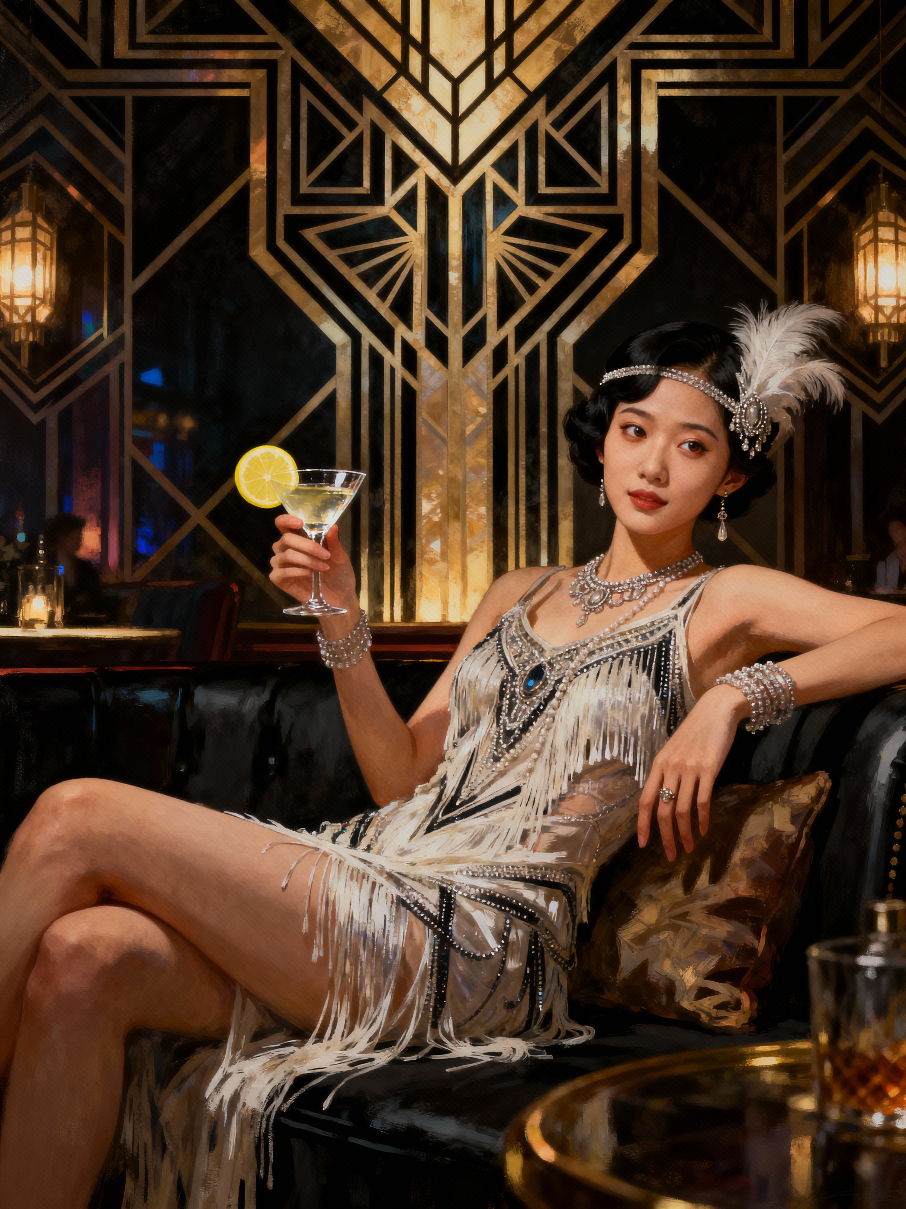 model, dimly lit upscale 1920s speakeasy, relaxed pose, fantasy, art deco, detailed painterly digital art style by coles phillips and alfred charles parker, πΈπ