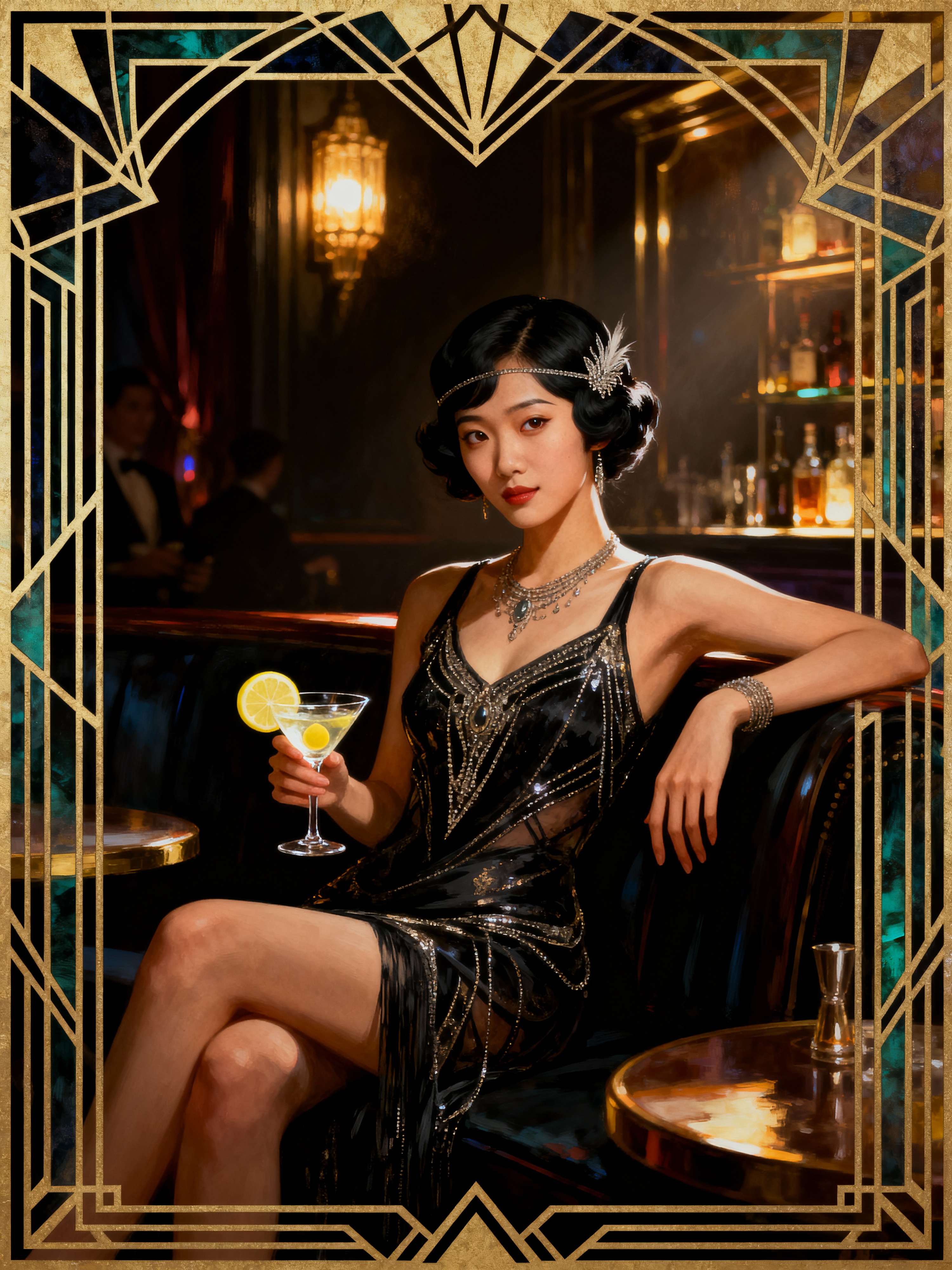 model, dimly lit upscale 1920s speakeasy, relaxed pose, fantasy, art deco, detailed painterly digital art style by coles phillips and alfred charles parker, πΈπ