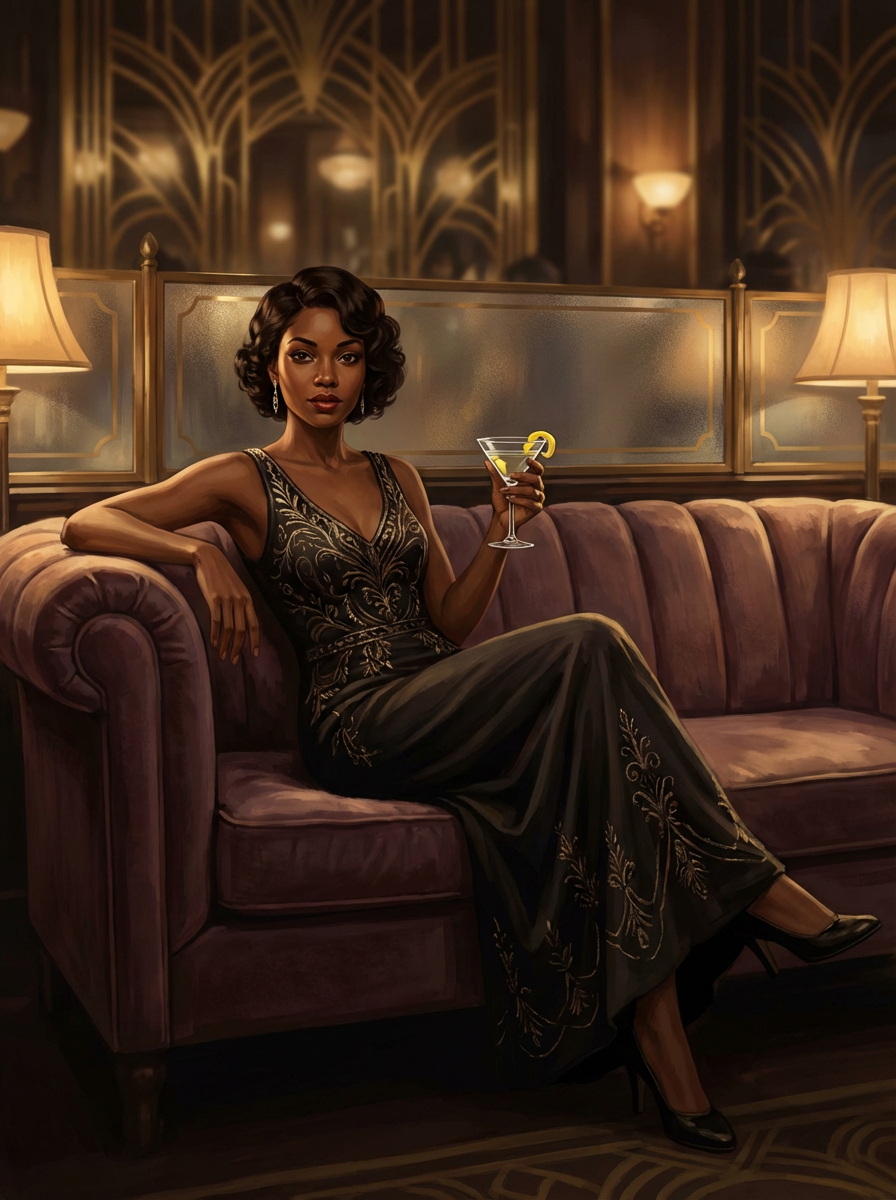 model, dimly lit upscale 1920s speakeasy, relaxed pose, fantasy, art deco, detailed painterly digital art style by coles phillips and alfred charles parker, ๐ธ๐