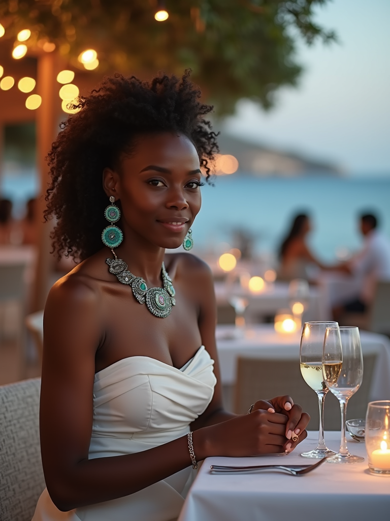 model dining at a seaside taverna, wearing an elegant white evening dress with turquoise accessories , candlelit tables and ocean view