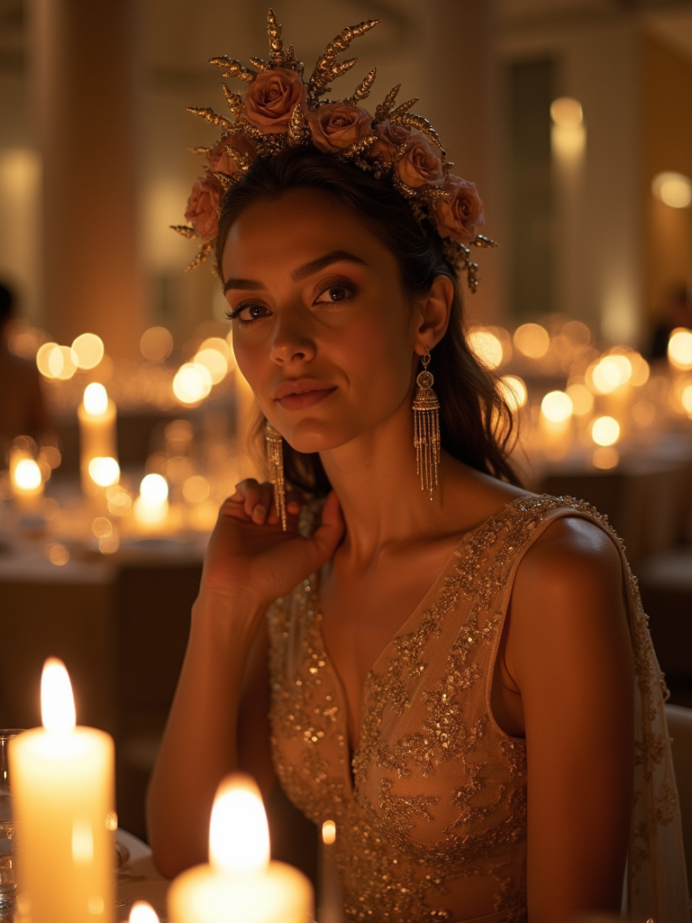 model dining at the lavish Met Gala dinner in the Temple of Dendur, wearing an opulent evening dress with theatrical elements , elaborate floral centerpieces and candlelit tables arranged throughout the museum space