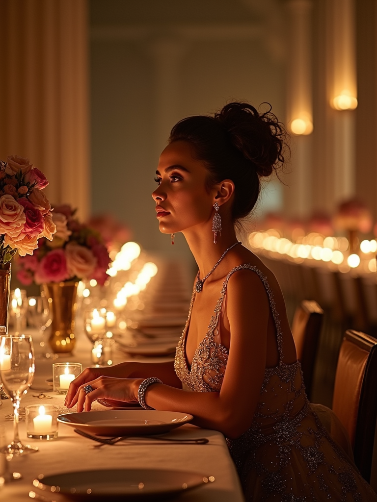 model dining at the lavish Met Gala dinner in the Temple of Dendur, wearing an opulent evening dress with theatrical elements , elaborate floral centerpieces and candlelit tables arranged throughout the museum space