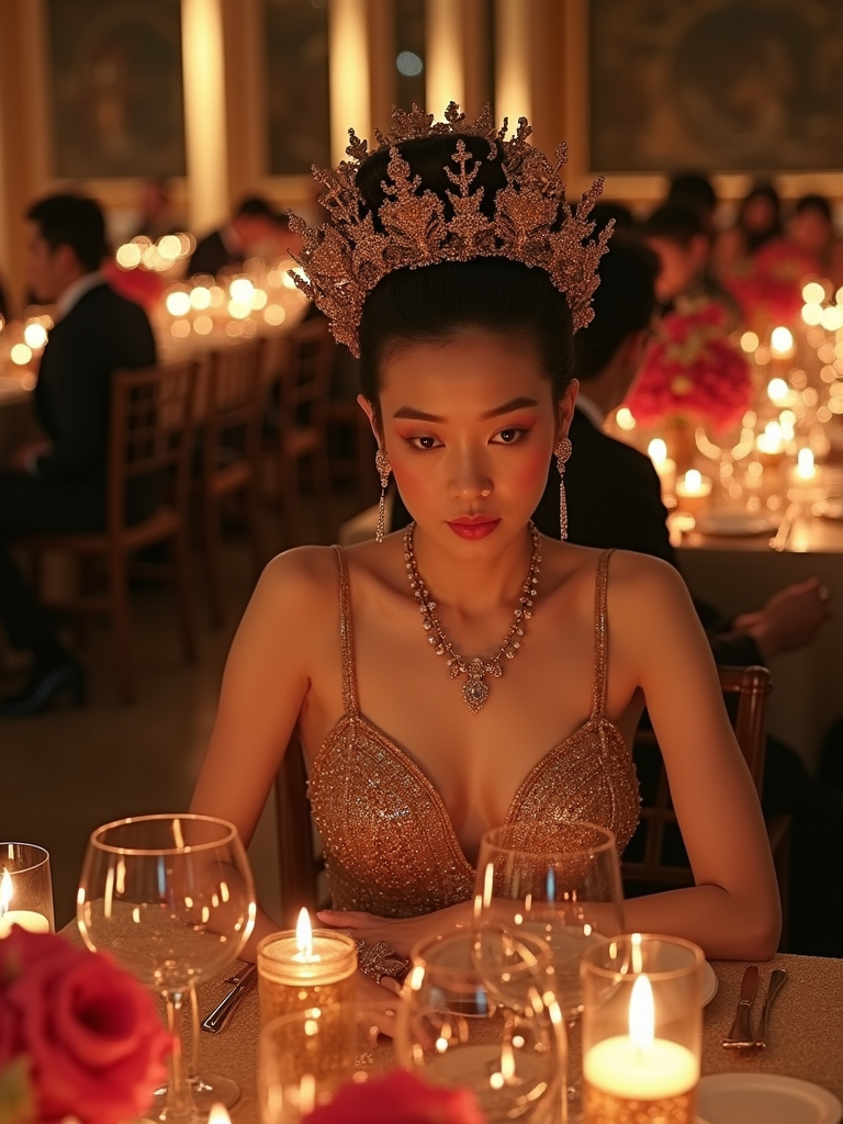 model dining at the lavish Met Gala dinner in the Temple of Dendur, wearing an opulent evening dress with theatrical elements , elaborate floral centerpieces and candlelit tables arranged throughout the museum space