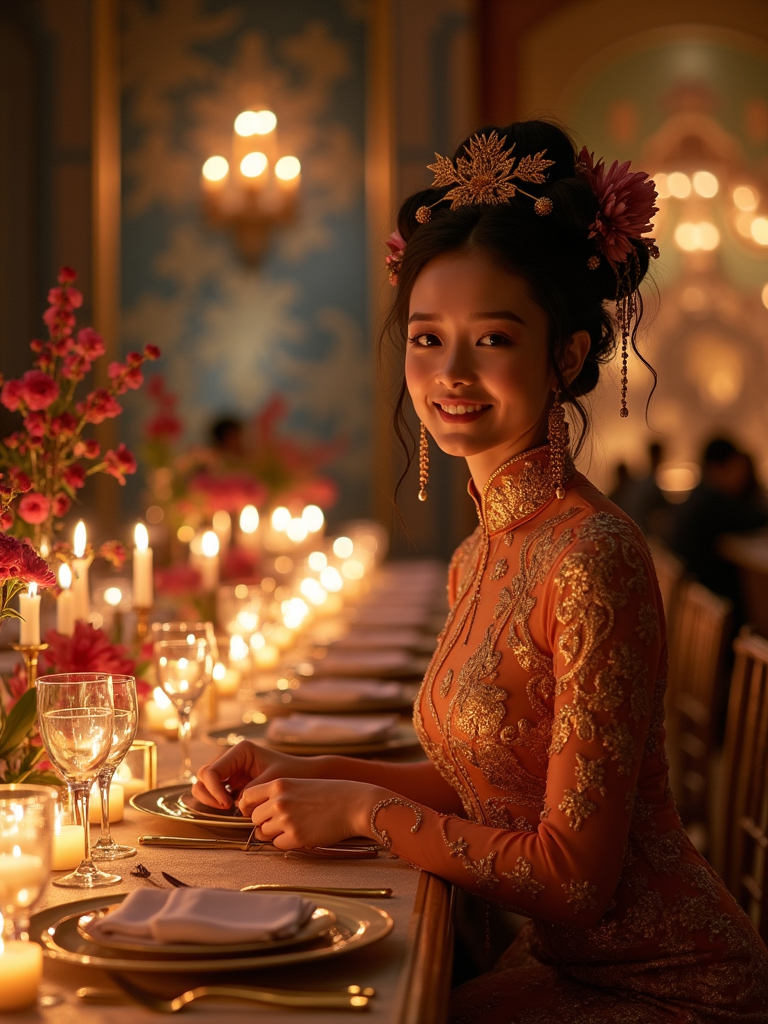 model dining at the lavish Met Gala dinner in the Temple of Dendur, wearing an opulent evening dress with theatrical elements , elaborate floral centerpieces and candlelit tables arranged throughout the museum space