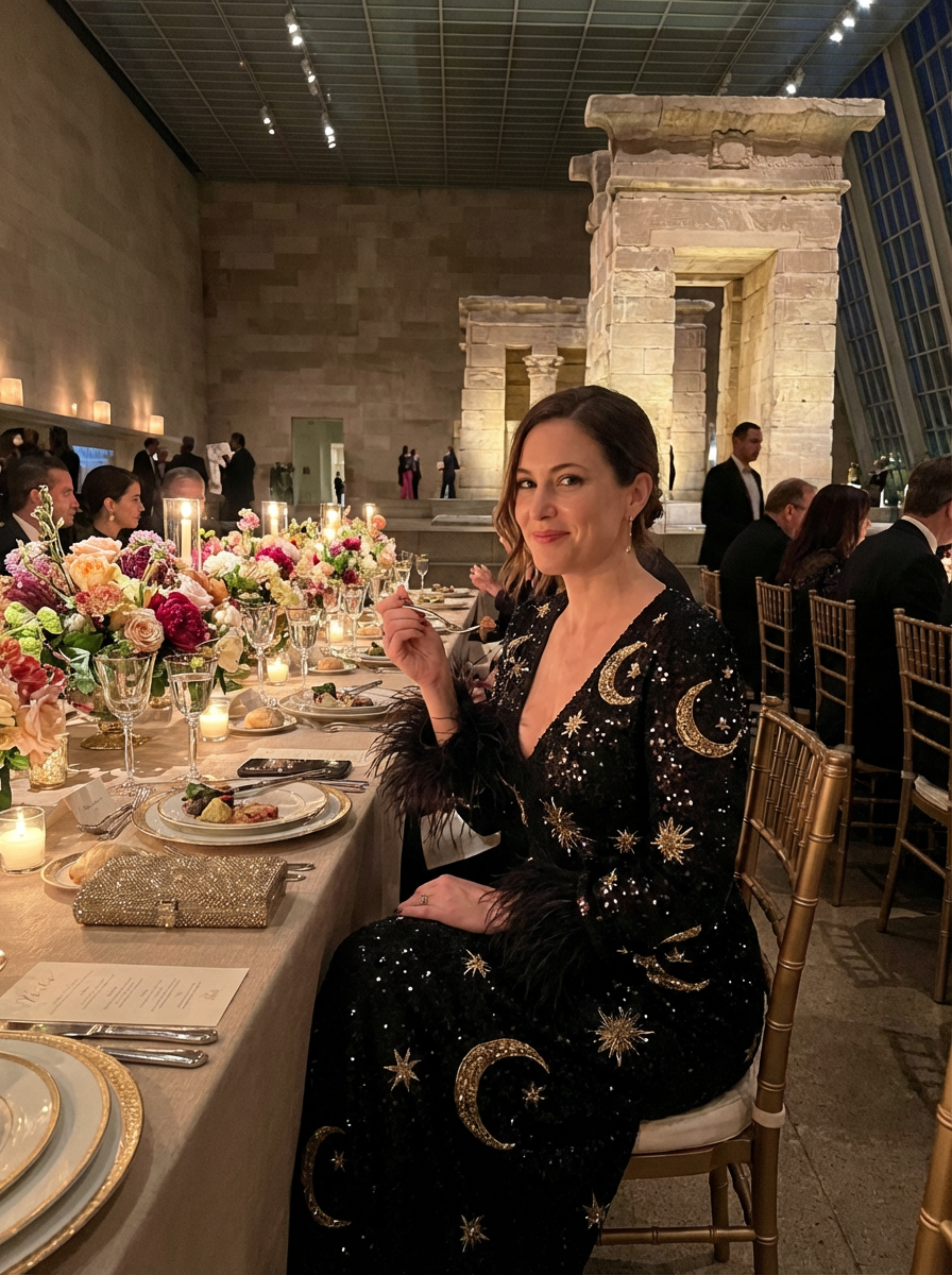 model dining at the lavish Met Gala dinner in the Temple of Dendur, wearing an opulent evening dress with theatrical elements , elaborate floral centerpieces and candlelit tables arranged throughout the museum space
