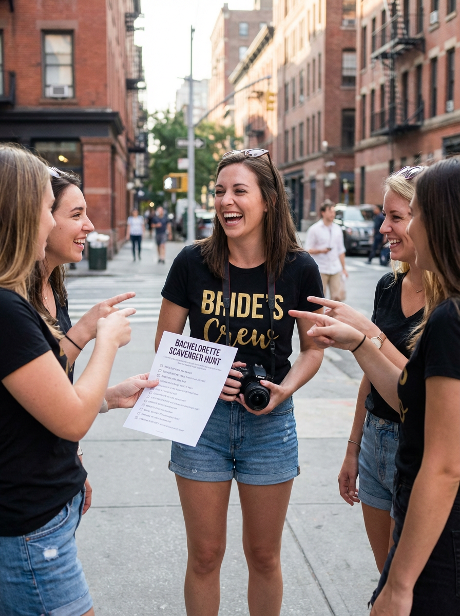 model doing bachelorette activities, scavenger hunt or games, fun challenges, group laughter