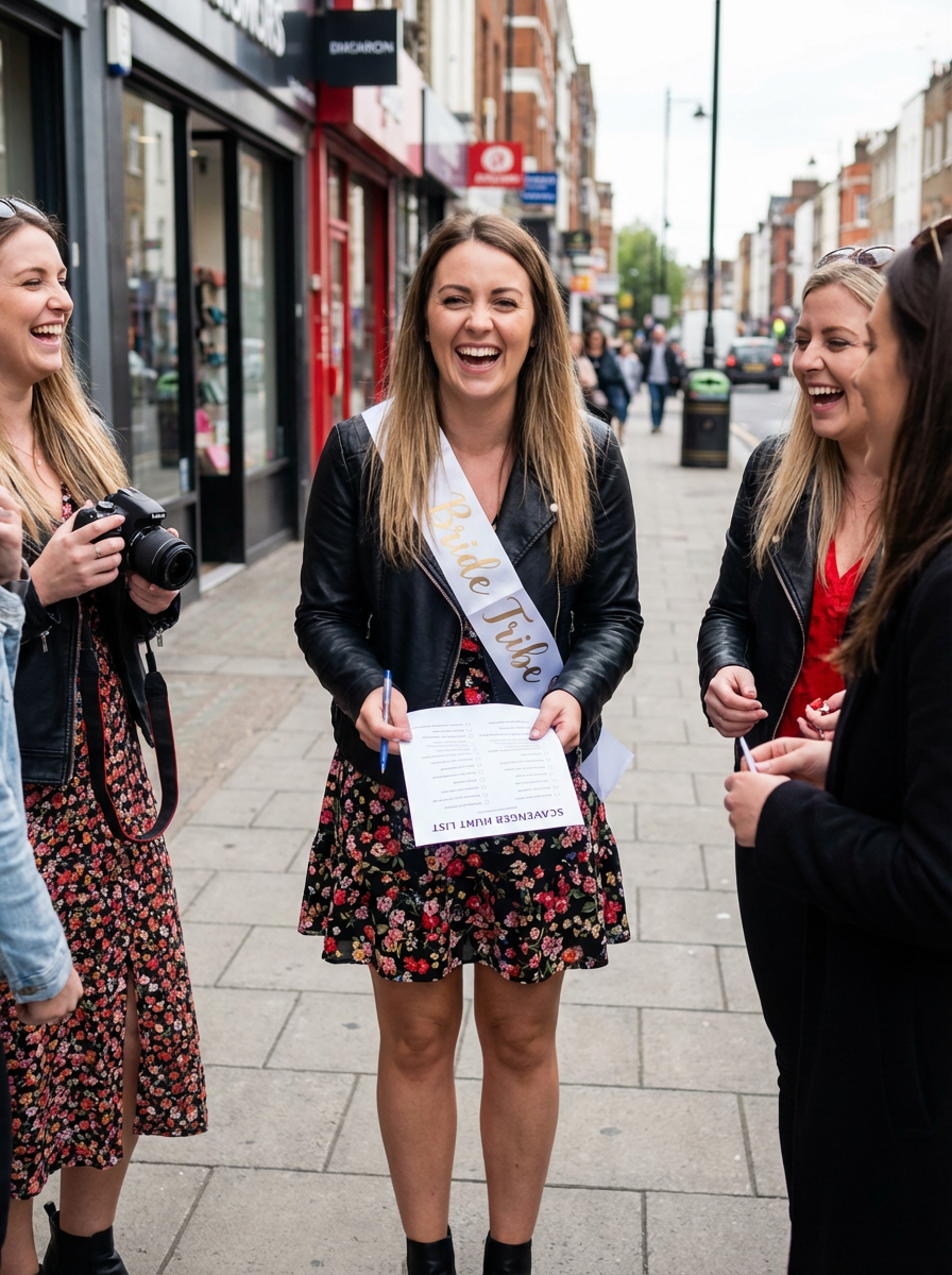 model doing bachelorette activities, scavenger hunt or games, fun challenges, group laughter
