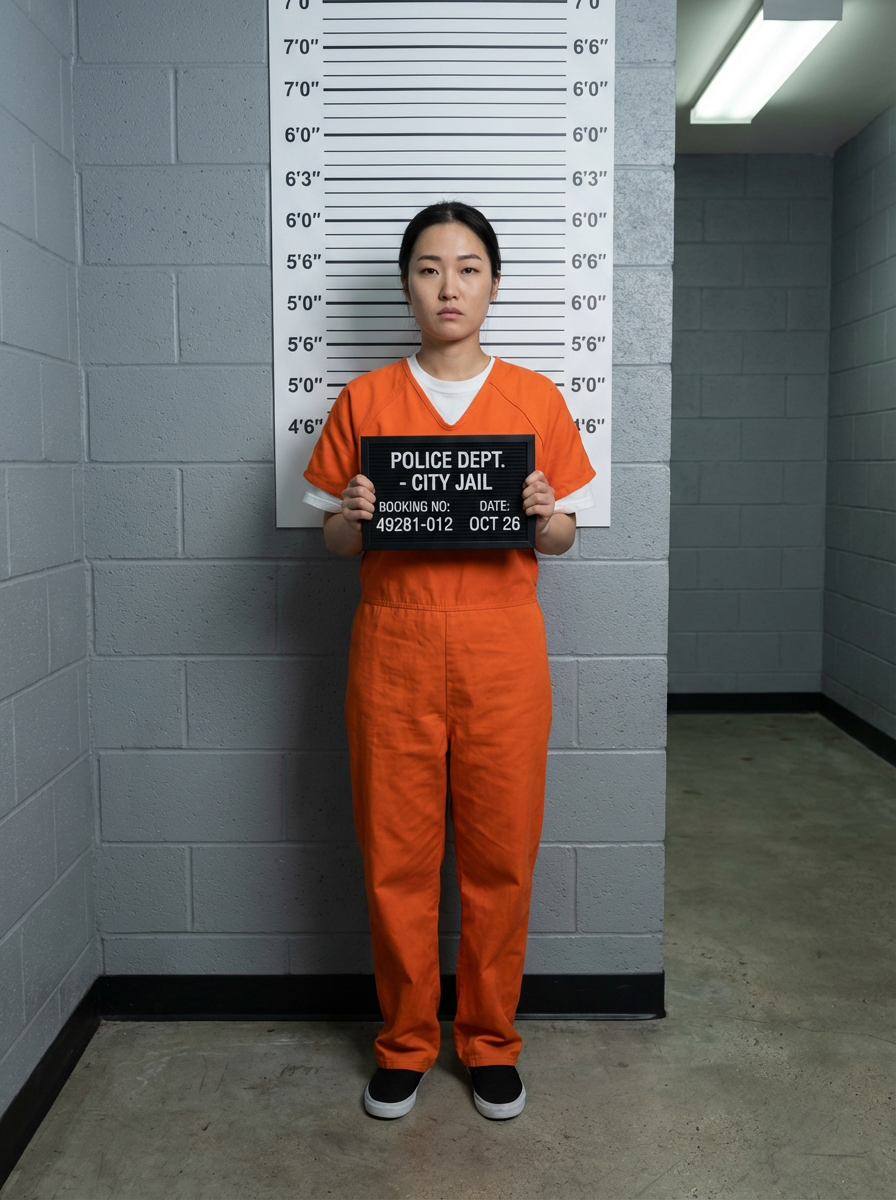 model doing classic mugshot pose, stoic face, orange jumpsuit visible at collar, institutional setting