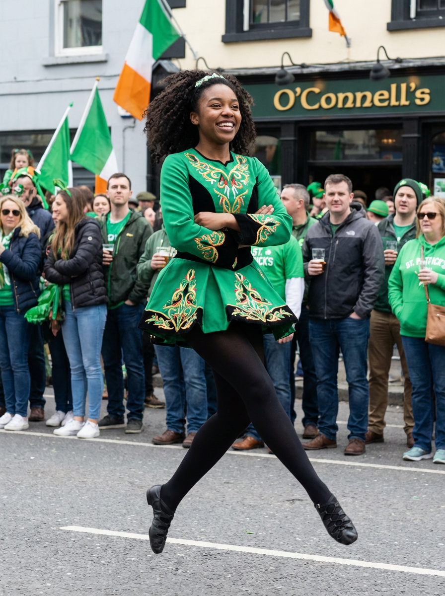 model doing Irish jig dance, St Patricks Day festivities, traditional elements, energetic pose
