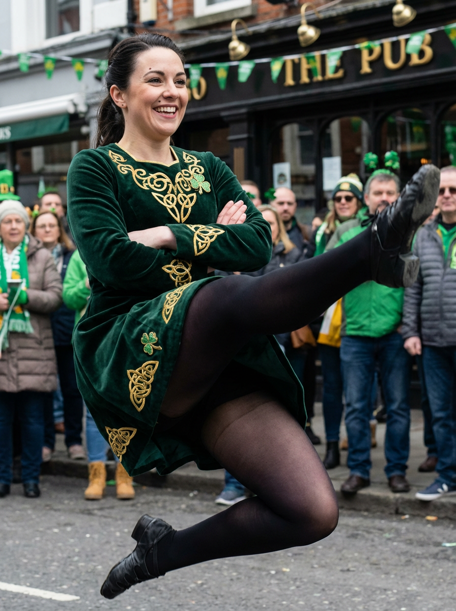 model doing Irish jig dance, St Patricks Day festivities, traditional elements, energetic pose