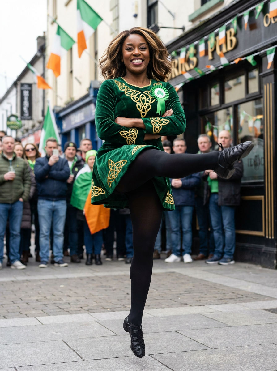 model doing Irish jig dance, St Patricks Day festivities, traditional elements, energetic pose