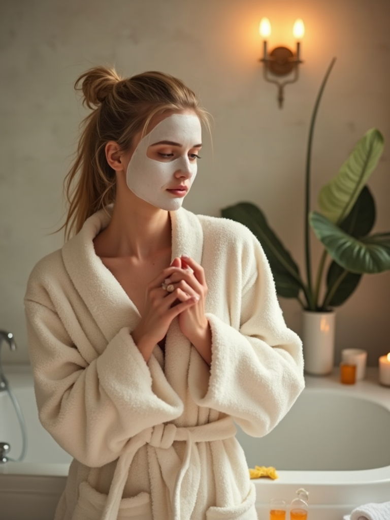 model doing skincare routine in bathroom, wearing plush white robe , applying face mask, surrounded by candles and plants, gentle morning light, serene spa-like atmosphere