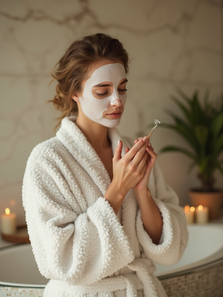 model doing skincare routine in bathroom, wearing plush white robe , applying face mask, surrounded by candles and plants, gentle morning light, serene spa-like atmosphere