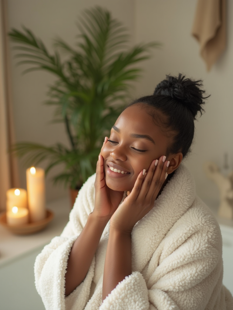 model doing skincare routine in bathroom, wearing plush white robe , applying face mask, surrounded by candles and plants, gentle morning light, serene spa-like atmosphere