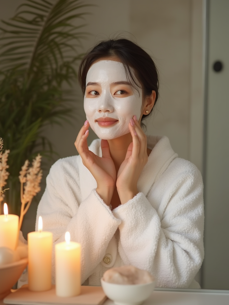 model doing skincare routine in bathroom, wearing plush white robe , applying face mask, surrounded by candles and plants, gentle morning light, serene spa-like atmosphere