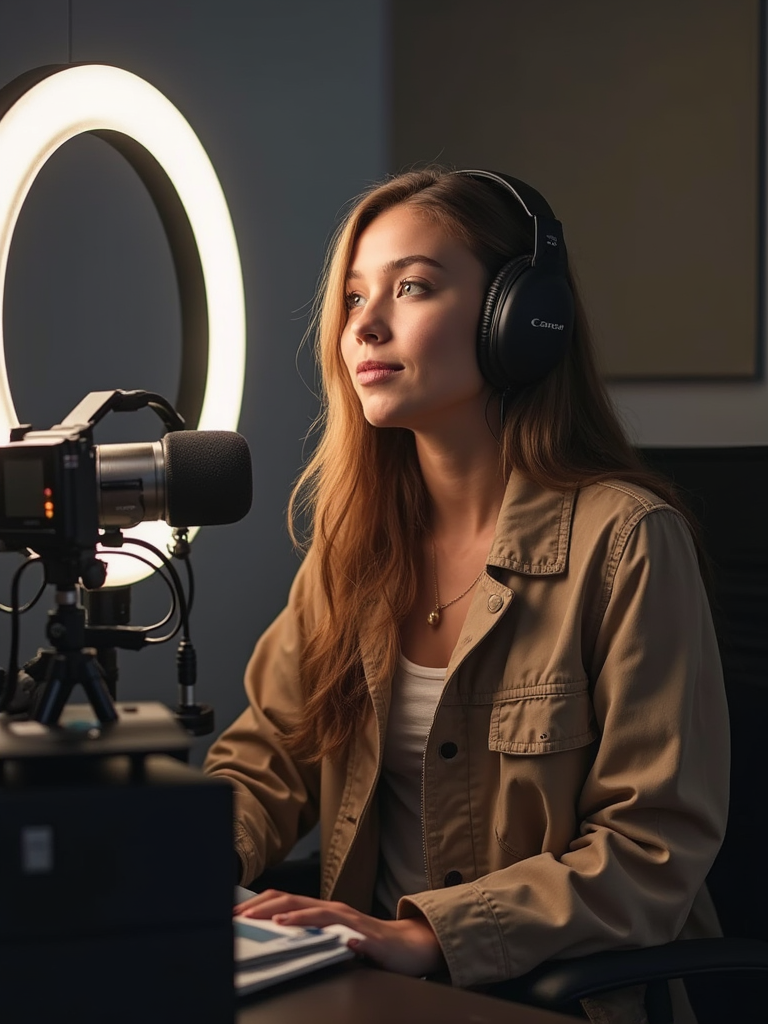 model doing video podcast, wearing camera-ready outfit , ring light and camera visible, dual setup for audio and video, modern creator space