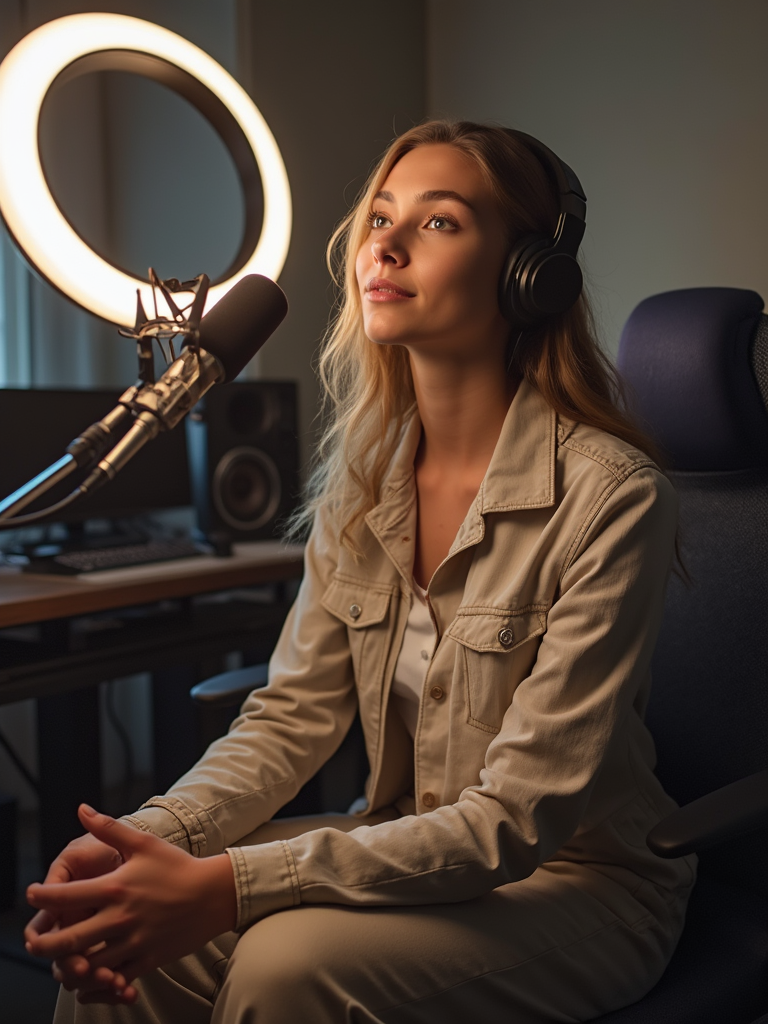 Related photoswoman in professional podcast booth, wearing elegant top , isolation booth setup, professional microphone, focused expression, broadcast quality lightingwoman doing video podcast, wearing camera-ready outfit , ring light and camera visible, dual setup for audio and video, modern creator spacewoman as podcast co-host, wearing smart casual outfit , sharing microphone space, collaborative setup, warm studio atmosphere, friendly interactionwoman in a trendy café, holding a freshly brewed cup of coffeeman as NASA Astronaut in space suitwoman wearing Y2K aesthetic, 2000s fashion, aughts style, noughties style, grunge or 2000s style, oversized washed out style, baggy pants, low rise pants or cargo pants, crop top, Choker, metallic glossy, iridescent fabrics, posing for photo