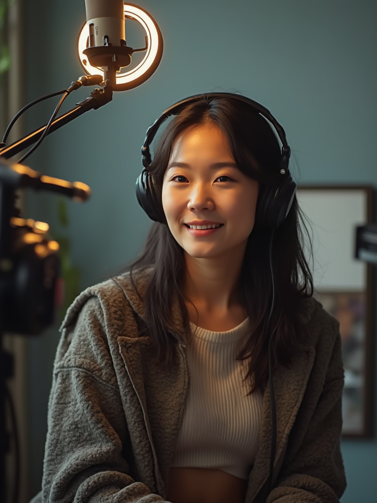 model doing video podcast, wearing camera-ready outfit , ring light and camera visible, dual setup for audio and video, modern creator space