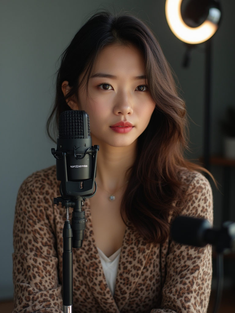 model doing video podcast, wearing camera-ready outfit , ring light and camera visible, dual setup for audio and video, modern creator space