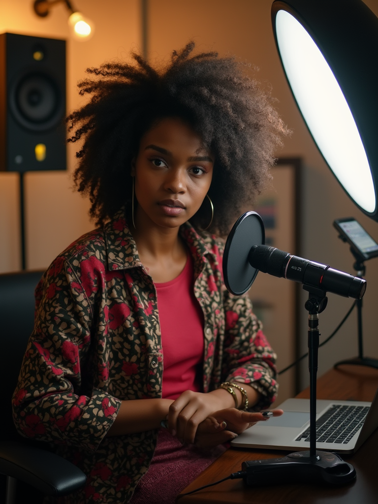 model doing video podcast, wearing camera-ready outfit , ring light and camera visible, dual setup for audio and video, modern creator space