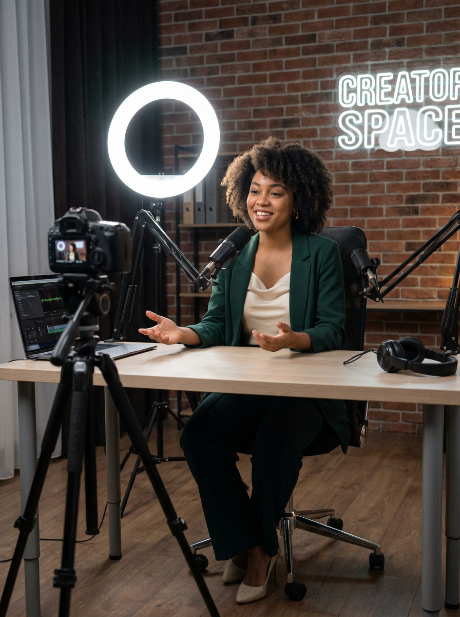 model doing video podcast, wearing camera-ready outfit , ring light and camera visible, dual setup for audio and video, modern creator space