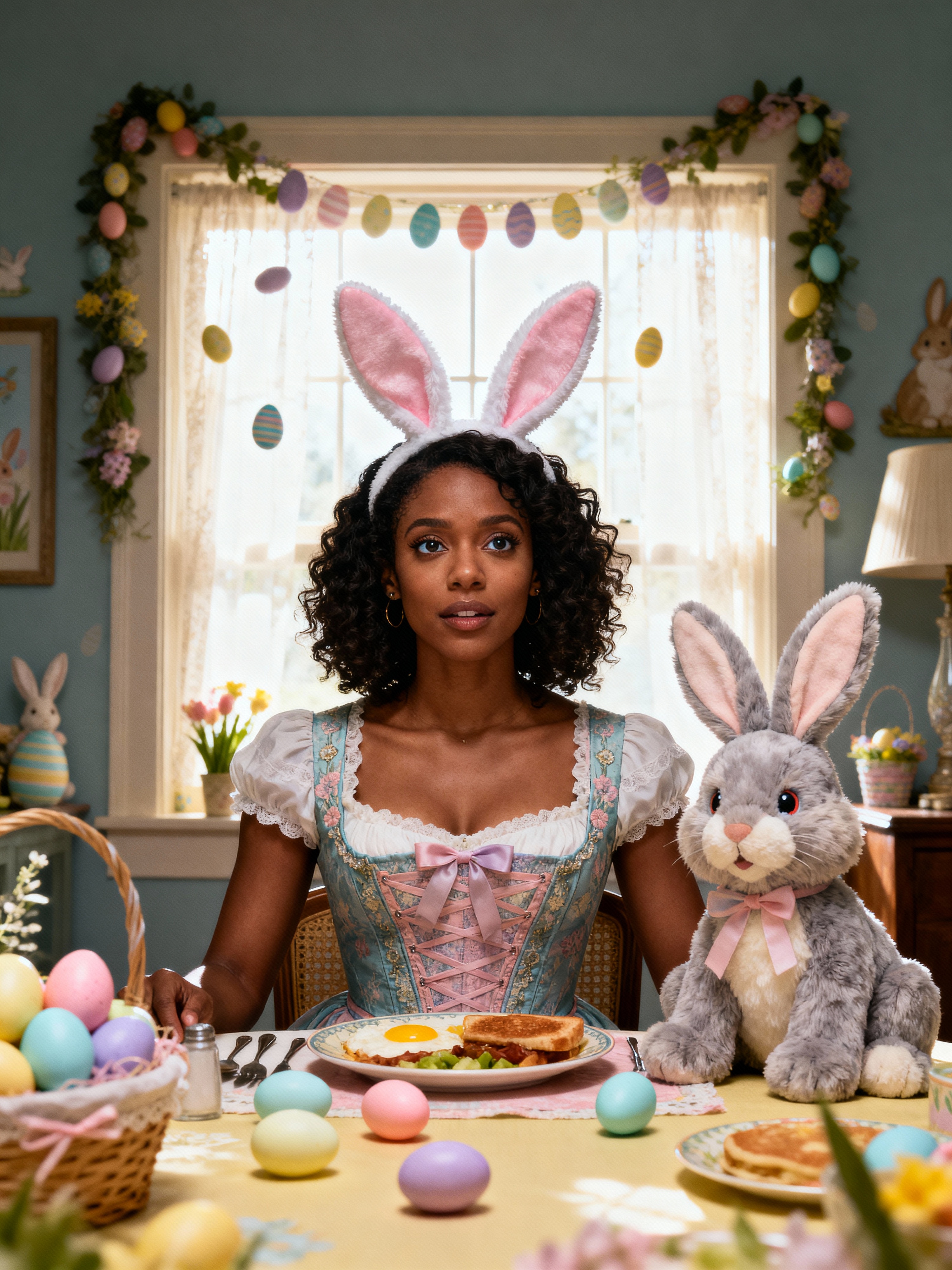 model dressed up for Easter with Easter Bunny Ears at the Easter Breakfast. Easter Eggs. Easter Bunny