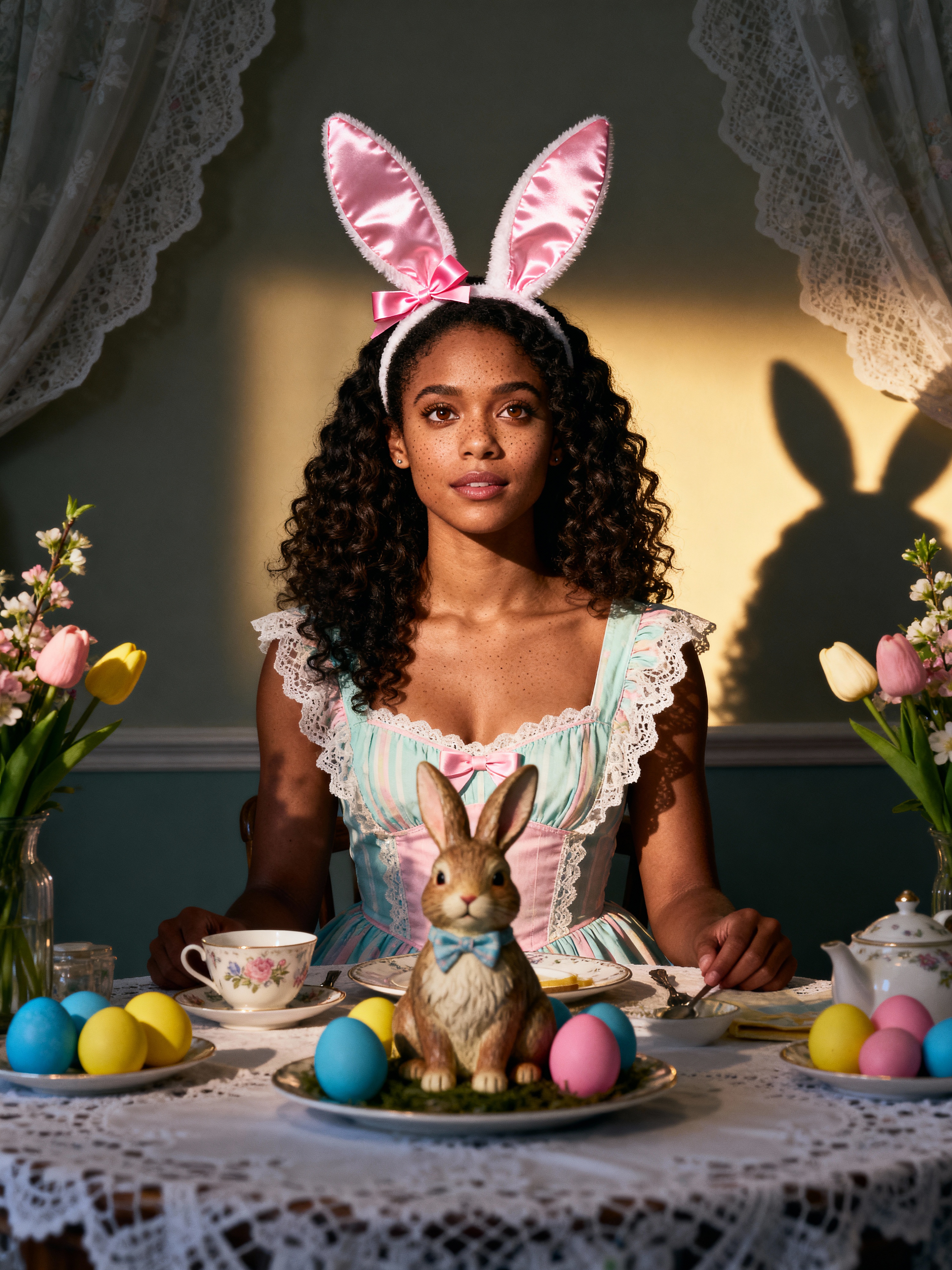 model dressed up for Easter with Easter Bunny Ears at the Easter Breakfast. Easter Eggs. Easter Bunny