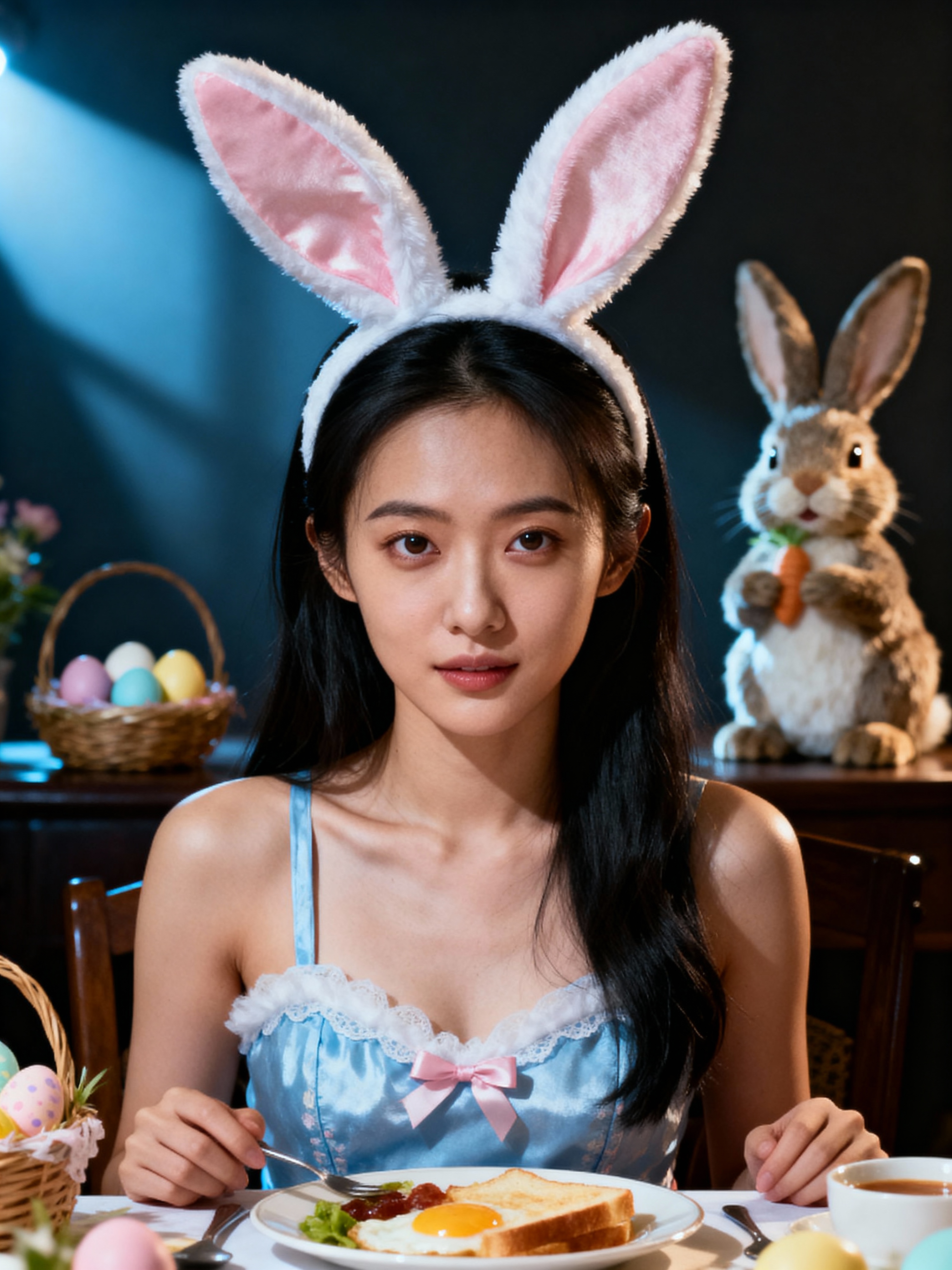 model dressed up for Easter with Easter Bunny Ears at the Easter Breakfast. Easter Eggs. Easter Bunny