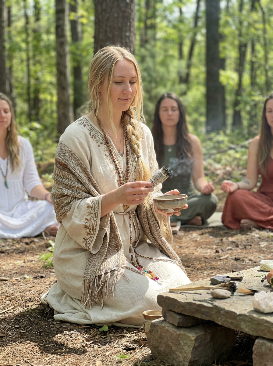 model engaged in a sacred ritual or ceremony, adorned with symbolic attire