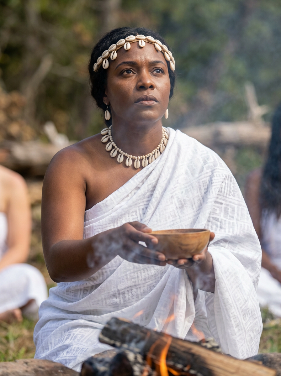 model engaged in a sacred ritual or ceremony, adorned with symbolic attire