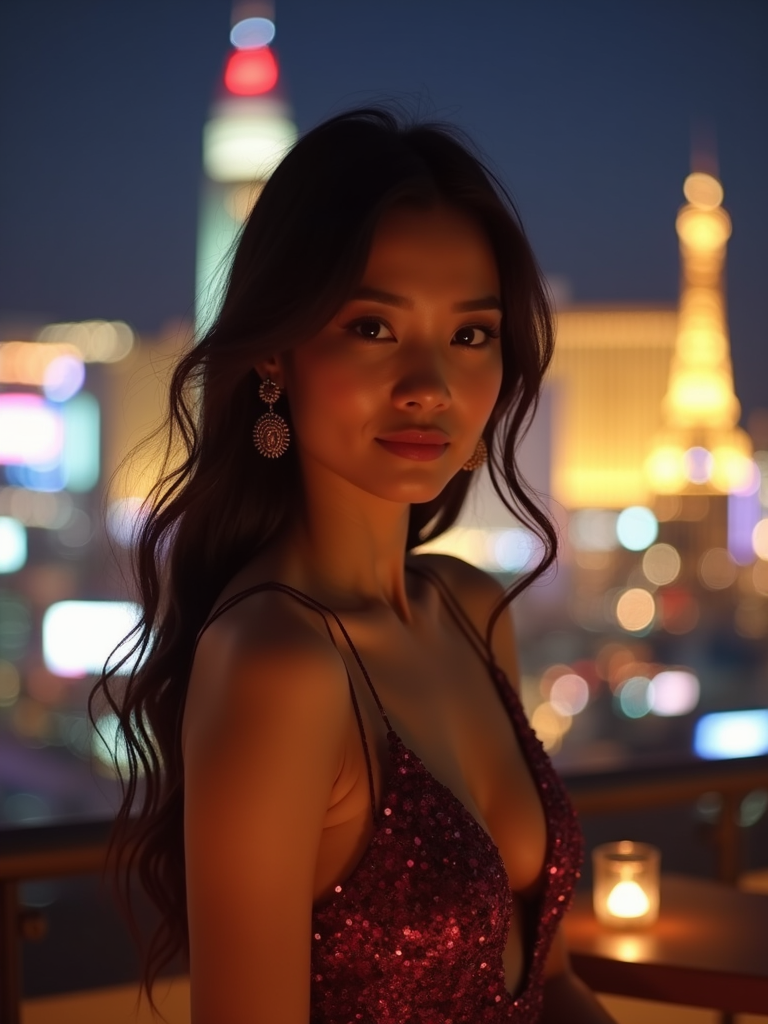 model enjoying a night out at a rooftop bar with views of the Las Vegas skyline. at night. the model wears a stylish cocktail dress and elegant accessories.