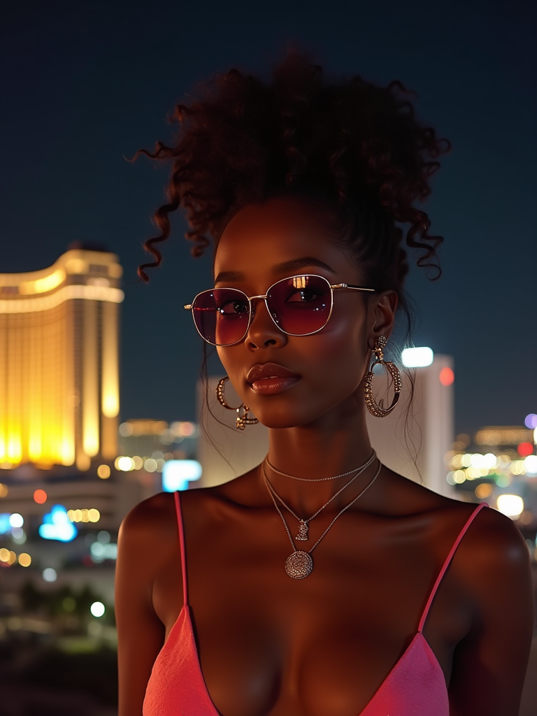 model enjoying a night out at a rooftop bar with views of the Las Vegas skyline. at night. the model wears a stylish cocktail dress and elegant accessories.