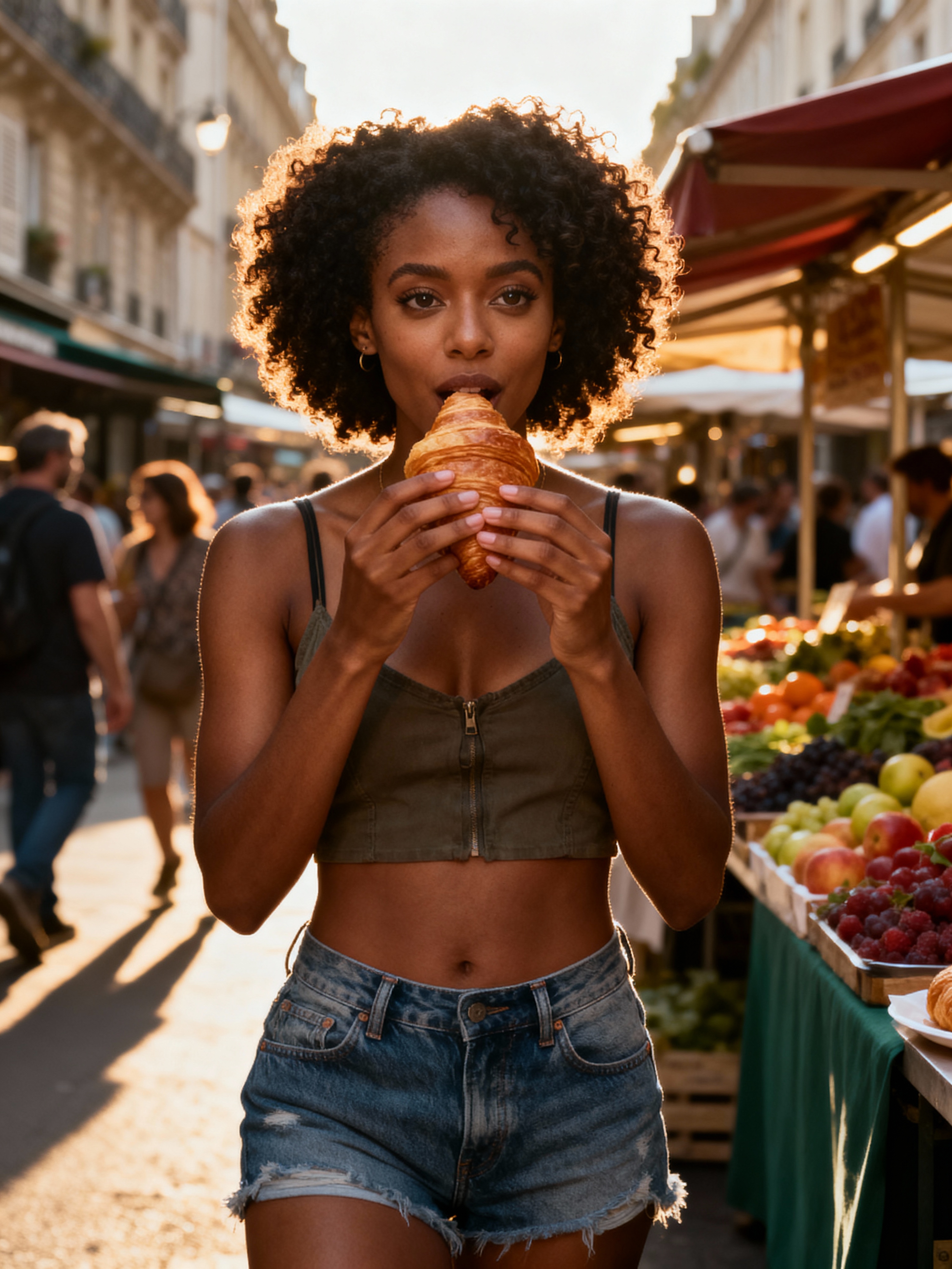 model enjoying street food at a Parisian market, wearing denim shorts and a crop top , holding a croissant