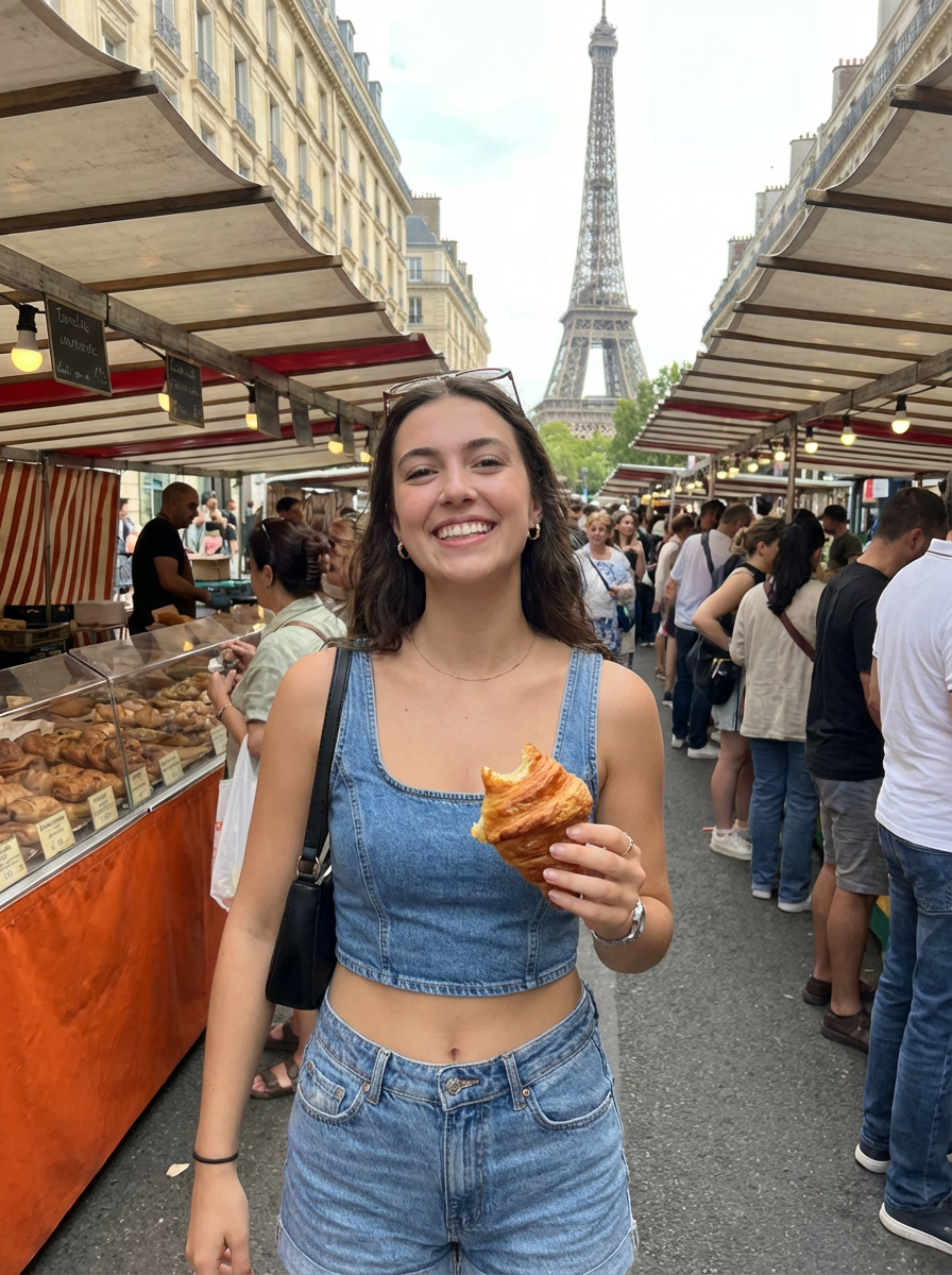 model enjoying street food at a Parisian market, wearing denim shorts and a crop top , holding a croissant
