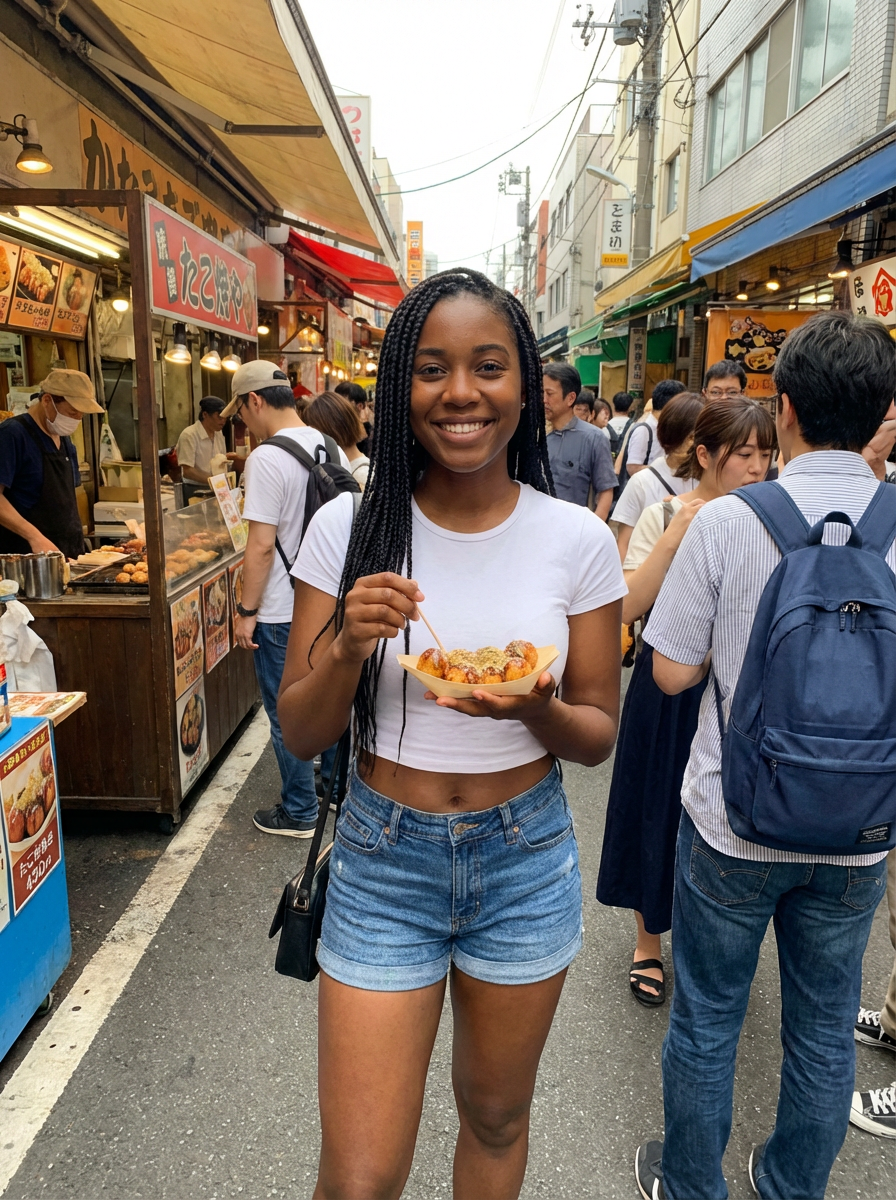 model enjoying street food at Tsukiji Outer Market, wearing denim shorts and a crop top , holding takoyaki