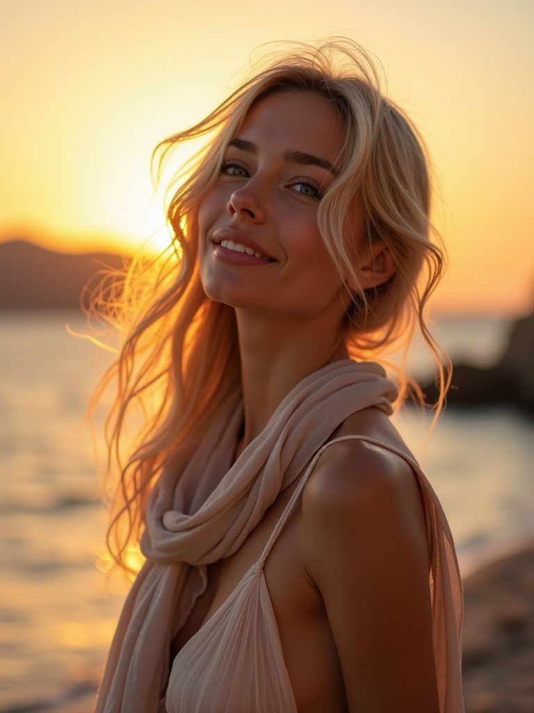 model enjoying sunset at Amoudi Bay, wearing a romantic evening dress with light scarf , golden hour lighting on seaside tavernas